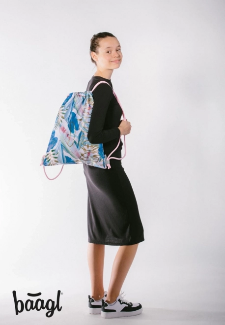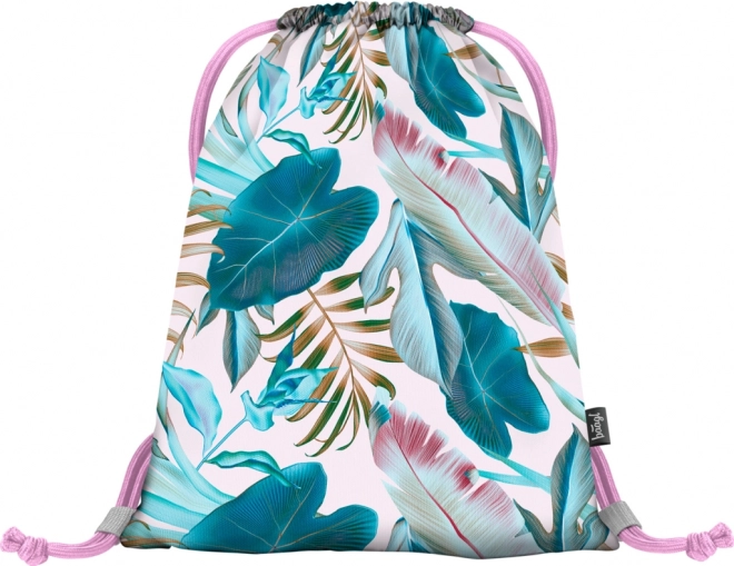 Ein leuchtendes, farbenfrohes Muster mit tropischen Blättern verleiht dem Beutel einen frischen und modernen Look.