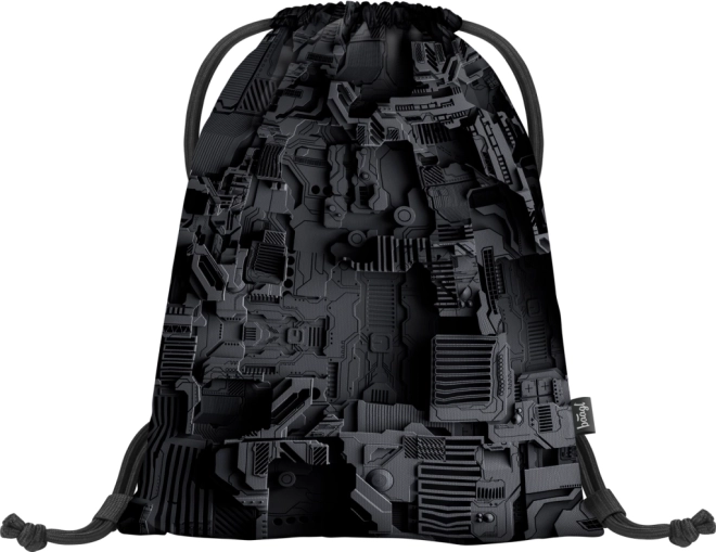 Der Rucksack besticht durch sein 3D-geometrisches Design in Schwarz und Grau, was ihm ein modernes und technologisches Aussehen verleiht.