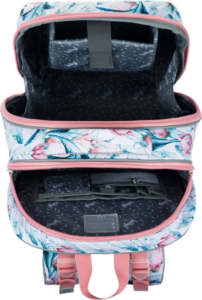 Der Ranzen mit verstärktem Körper fungiert als schützender Panzer. Zwei Fächer und ein Organisator im Inneren bieten ausreichend Platz für alle Schulsachen.