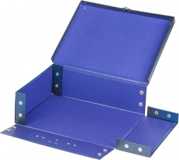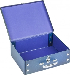 • Zusammenklappbarer Koffer aus festem, laminiertem Papier mit beschlagenen Ecken.