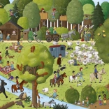 Auf jeder Doppelseite Figuren und Tiere suchen und ihren kleinen Geschichten folgen – vom geschäftigen Tag bis zum abendlichen Fest. Trainiert Aufmerksamkeit und Gedächtnis auf spielerische Weise.