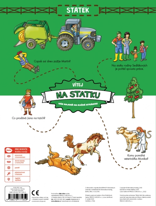 Dieses große Bilderbuch lädt Kinder zu einem Tagesausflug auf den Hof der Familie Sedláček ein. Sie schauen in Ställe, Hof und Felder, lernen Haustiere kennen und sehen, wie mit Maschinen gearbeitet wird und wie ein geschäftiger Tag auf dem Bauernhof aussieht. Jede Doppelseite lebt von detailreichen Illustrationen und kleinen Geschichten der Figuren, die sich durch das ganze Buch ziehen.