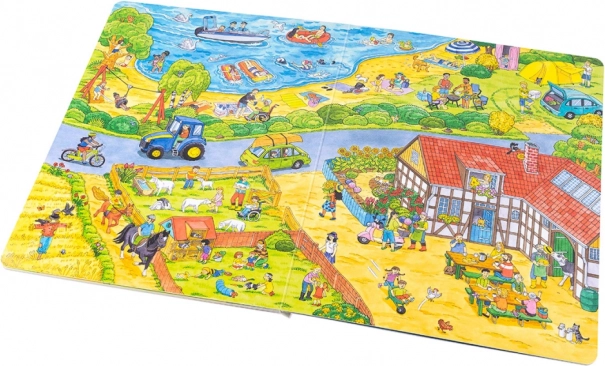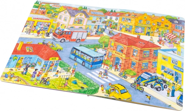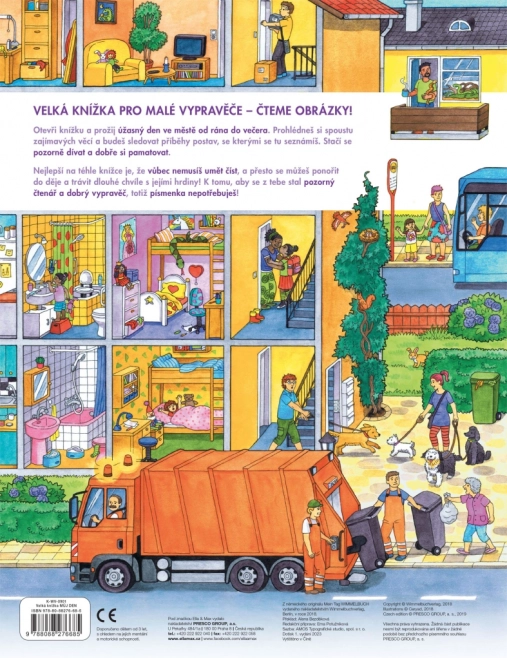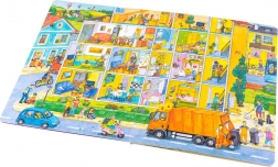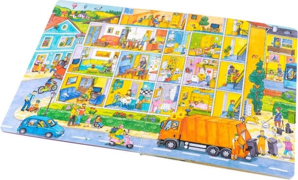 Dieses großformatige Buch ist ideal zum gemeinsamen Anschauen und Erzählen. Kinder lernen, was in der Stadt von morgens bis abends passiert – von der Arbeit der Müllabfuhr und dem Einkaufen über Kindergarten, Baustelle, Feuerwehr und Polizei bis hin zum Nachmittagsspaß im Park und Ausflügen an den See oder auf den Bauernhof. Jede Seite ist voller Anregungen zum Gespräch und zum Entdecken von Details.