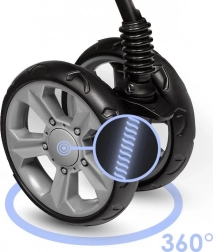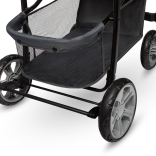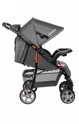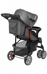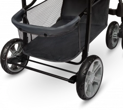 Sicherheit hat Priorität: Fünfpunktgurte mit weichen Polstern, ein Schutzbügel mit Tablett und Becherhalter sowie Tests gemäß Norm EN 1888 (SGS-Labor) sorgen für verlässliche Sicherheit im Alltag. Die wendigen EVA-Räder mit weicher Federung an der Vorderachse dämpfen Unebenheiten, fahren leicht durch die Stadt und die Arretierung für die Geradeausfahrt hält die Spur auf Kopfsteinpflaster stabil.