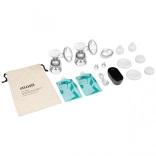 Stromversorgung per USB, aus der Steckdose oder mit Batterien. Im Set: 2 Fläschchen à 150 ml, Muttermilchbeutel und ein praktischer Transportbeutel.