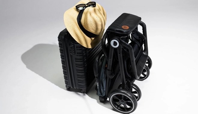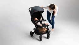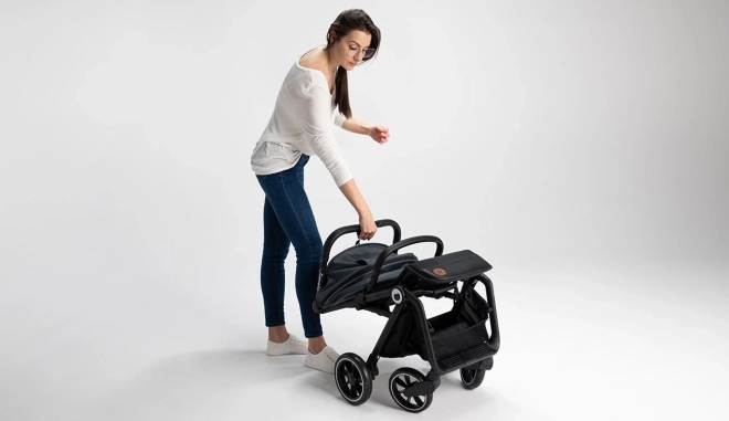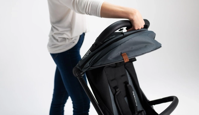 Mit einem Knopfdruck lässt sich der Kinderwagen zu einer kompakten Form zusammenklappen und dank Trageriemen bequem über der Schulter tragen – ideal für die Stadt und auf Reisen.