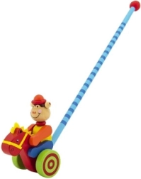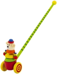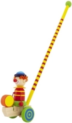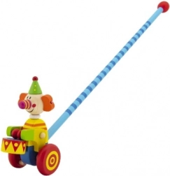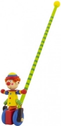 Fröhliches Holz-Schiebespielzeug mit einer Clownfigur, das jeden Schritt zum Tanzen bringt – beim Bewegen bewegt sich der Clown und unterhält die Kinder, und das Spielzeug funktioniert in beide Richtungen. Ideal zur Förderung der Motorik von Kindern ab 12 Monaten. Maße 60 × 10 × 8 cm, Farbenmix.