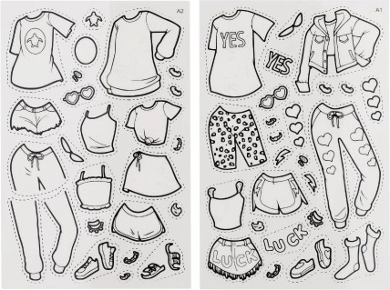 8 Models, 2 Bögen Kleidungsschablonen, 12 farbige Klebefolien, Accessoires