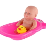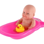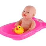 Enthalten sind eine rosa Kunststoffwanne und ein gelbes Entchen, die zu kreativem Spiel und eigenen Geschichten anregen. Leuchtende Farben und das einfache Design fördern die visuelle Stimulation und ziehen die Aufmerksamkeit der Kinder auf sich.