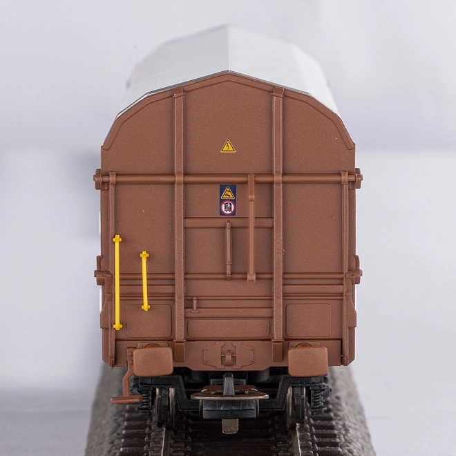 Dieses Set von zwei Waggons ist sorgfältig mit Augenmerk auf Details entworfen, einschließlich ausgefeilter Chassisformen und Frontwand mit Plane-Sicherung. Die Abdeckungen können abgenommen werden, was einen gegliederten Innenraum mit Ladeflächen zeigt - ein Muster in Form einer Blechrolle gehört zum Lieferumfang. Die Waggons verfügen über attraktive, farblich kontrastierende Details wie Handgriffe und Anker und sind mit einer hochwertigen Lackierung und einem scharfen Druck versehen, der auch die kleinsten Details erfasst.