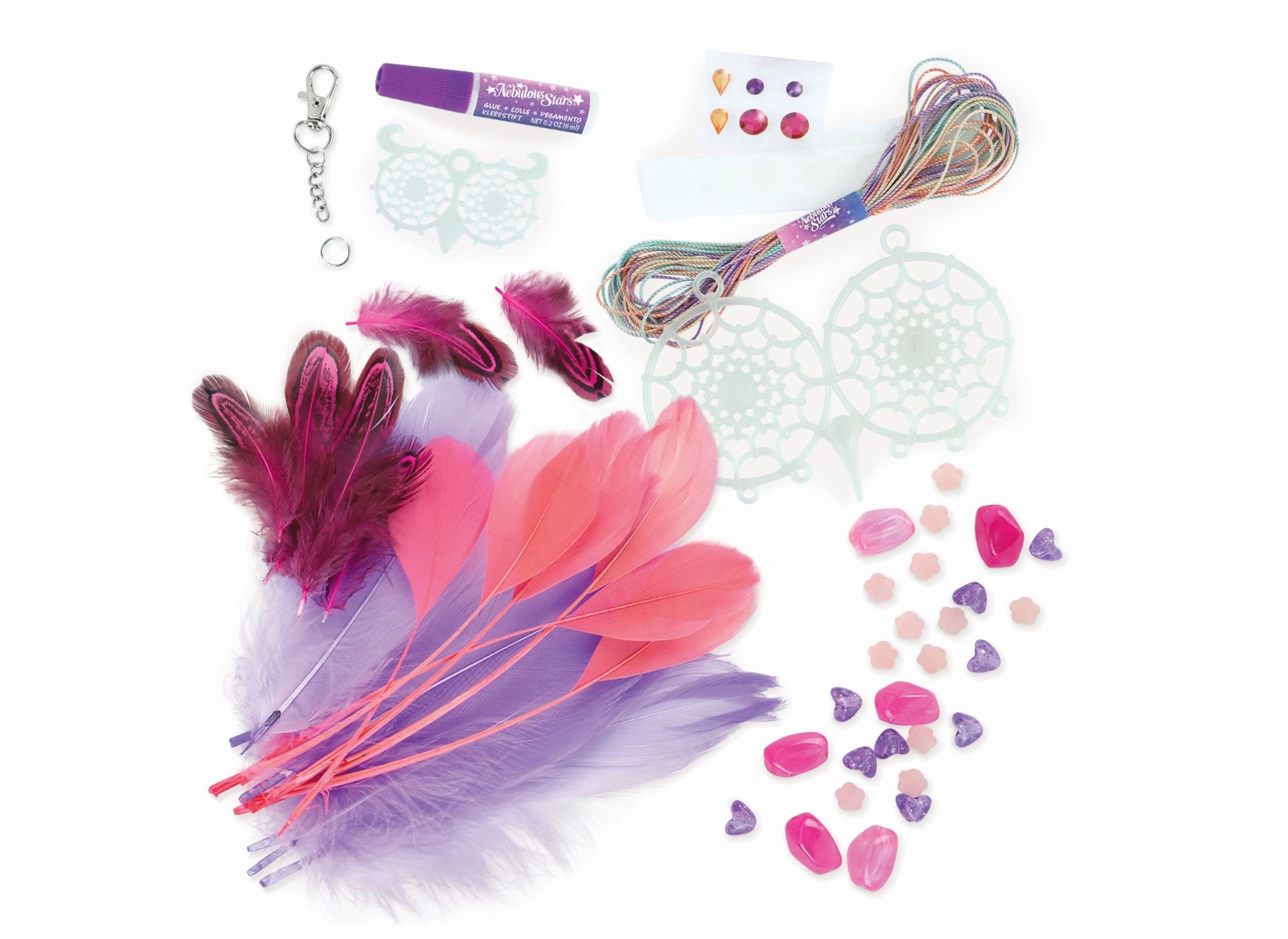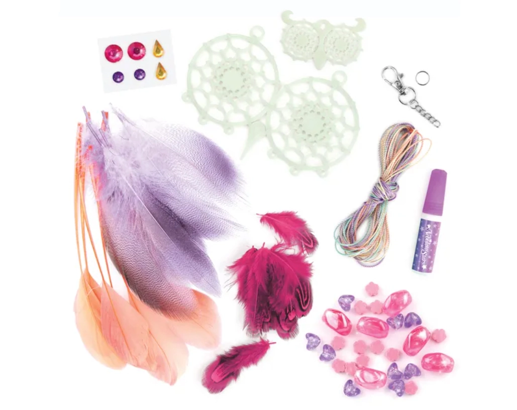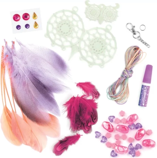 Das Set enthält 2 im Dunkeln leuchtende Traumfänger-Basen, Baumwollgarne, 28 Federn, 28 stylische Perlen, 6 Strass-Aufkleber und Schmuckkleber.