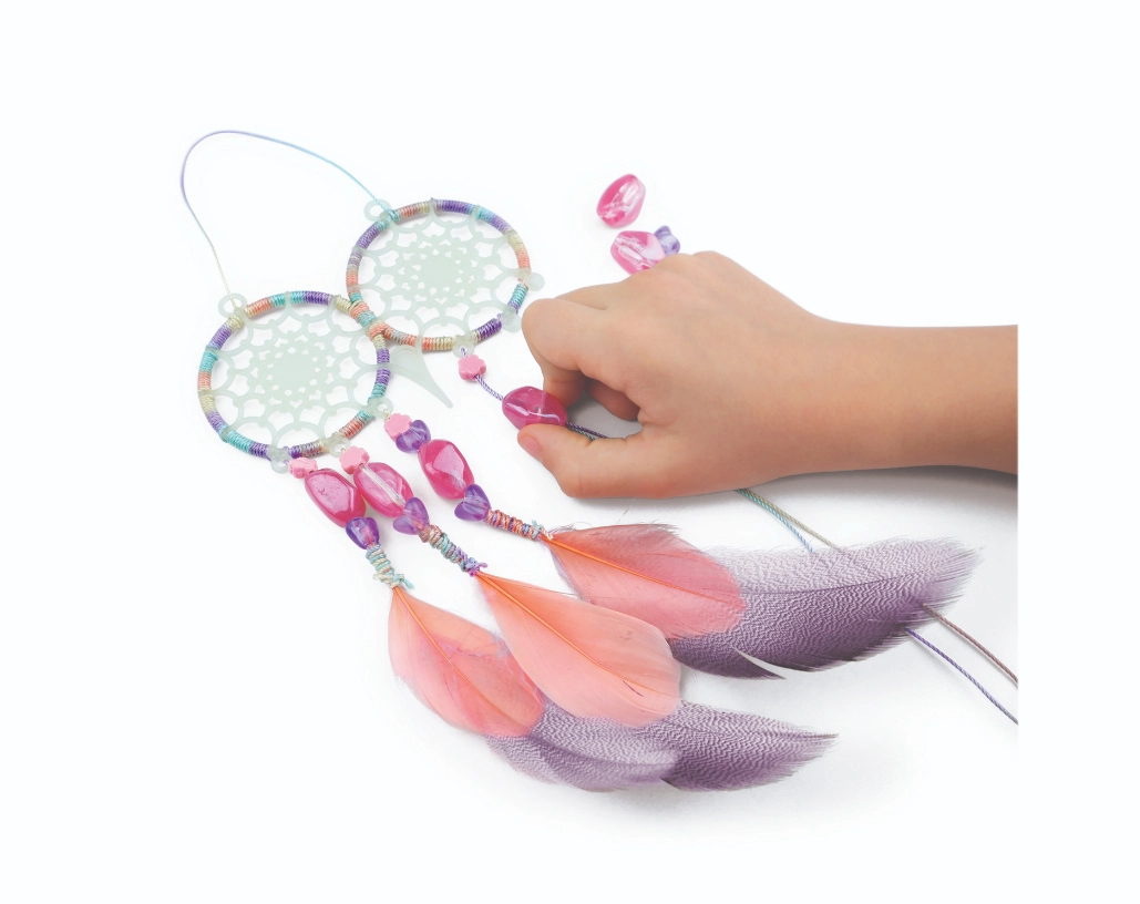 Kinder üben Geduld, das Auffädeln von Perlen und den Umgang mit Fäden. Dank der umfangreichen Ausstattung – von Federn über stylische Perlen bis hin zu Strass-Aufklebern – entstehen im Handumdrehen originelle Accessoires nach eigener Fantasie.