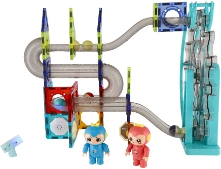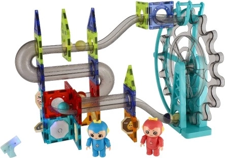 Mit diesem farbenfrohen Set lassen sich die magnetischen Teile leicht verbinden, um individuelle Kugelbahnen zu gestalten. Ist die Strecke fertig, steigt die Spannung – rollen die Kugeln vom Start bis ins Ziel? Für eine sichere Zielankunft wachen auch die niedlichen Figuren Nink und Wink. Das integrierte elektrische Rad dient als Kugelaufzug und sorgt zusätzlich für Licht- und Musikeffekte, die sich bei Bedarf ausschalten lassen.