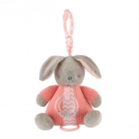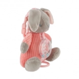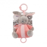 Niedliches Plüschhäschen für Babys, das eine aufziehbare Spieluhr mit beruhigender Melodie und eine integrierte Rassel für sanfte akustische Anreize kombiniert. Die weiche Ausführung in Grau-Rosa ist ideal für Kinder ab der Geburt und fördert Sinne und Motorik.
