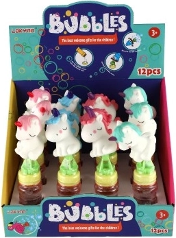 Die Anwendung ist kinderleicht: Gießen Sie die Lösung in den Deckel, tauchen Sie das Kunststoffteil mit dem Blasring ein, drehen Sie es um und drücken Sie die Einhornfigur. Eine tolle Wahl für Geburtstagsfeiern, den Garten und den Spielplatz.
