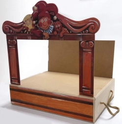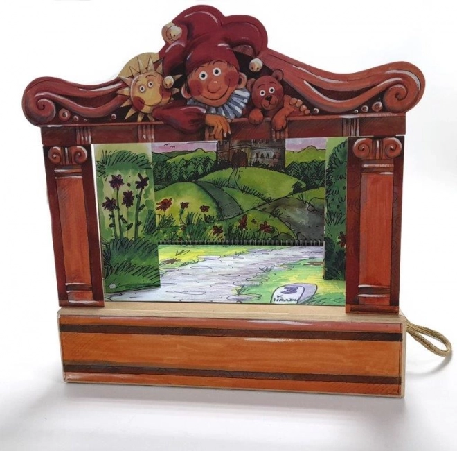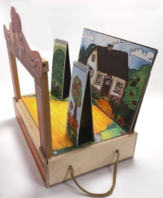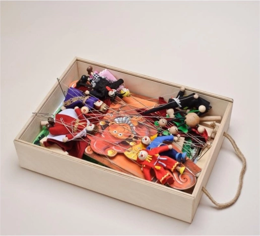 Im Set finden Sie 14 Holzpuppen, 11 farbige Szenen, ein Proszenium, einen Vorhang und Seitenkulissen – alles übersichtlich in einer Holzbox mit Griff verstaut.