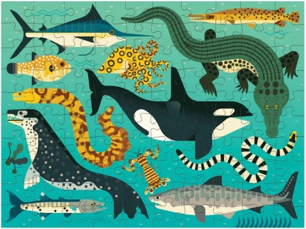 Dieses beeindruckende Puzzle zeigt auf der einen Seite die Landraubtiere, während auf der anderen Seite die Meeresjäger der Tiefen abgebildet sind. Hergestellt aus einem bedeutenden Anteil an recyceltem Papier, sorgt es für ökologische Nachhaltigkeit und Unbedenklichkeit der verwendeten Farben. Die Oberfläche ist matt, was eine originalgetreue Wiedergabe der Details und Farben garantiert, und die glatte Oberfläche der Rückseite verhindert Staubbildung bei der Lagerung.