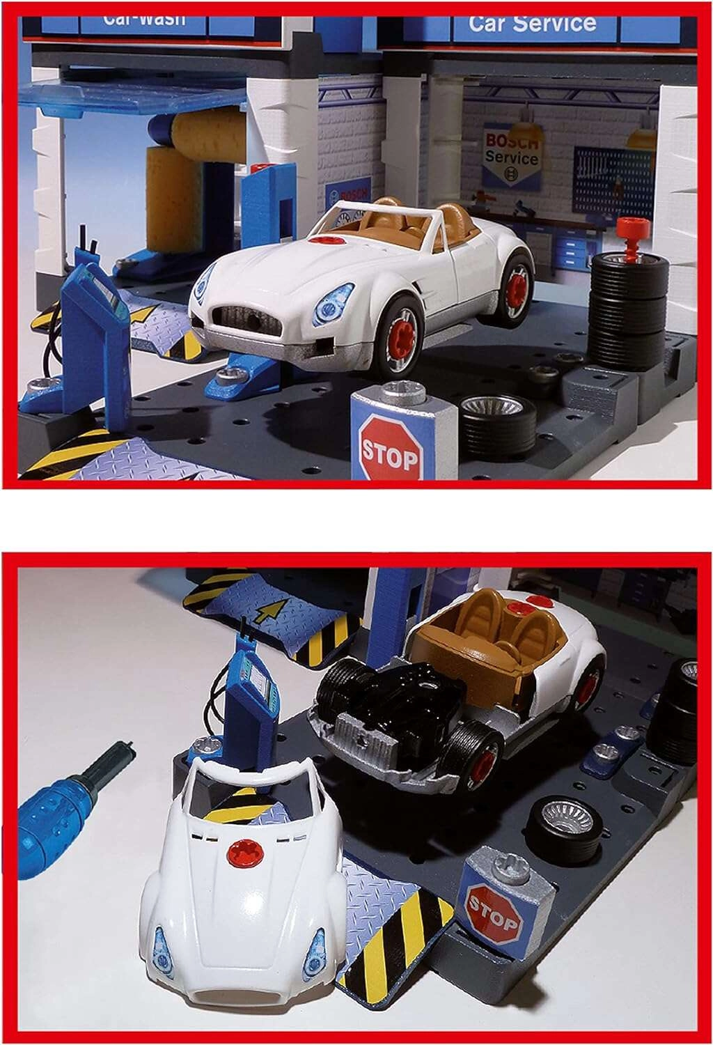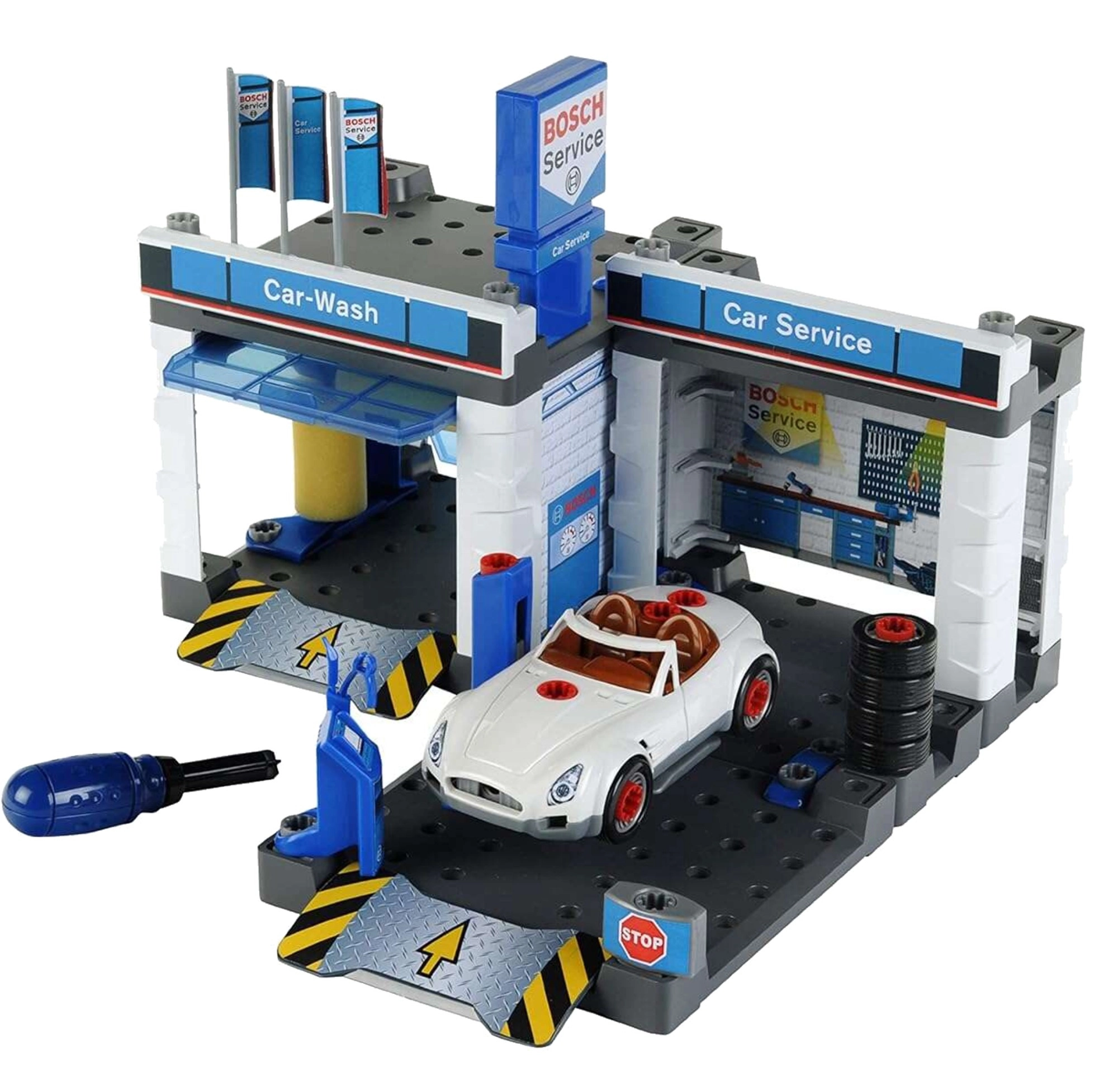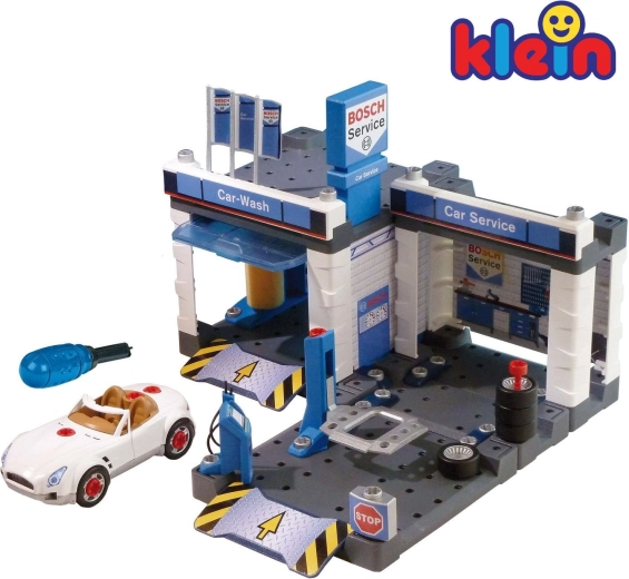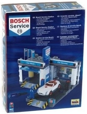 Diese Service-Station im BOSCH Service Design kombiniert Autowaschanlage, Servicebereich und Montagewerkstatt in einem. Enthalten ist ein weißes Cabrio, das Kinder mit dem beigelegten Schraubendreher auseinander- und wieder zusammenbauen können. Bewegliche Waschwalzen, eine Hebebühne und ein Servicepult mit „Computer“ sorgen für ein realistisches Spielerlebnis.