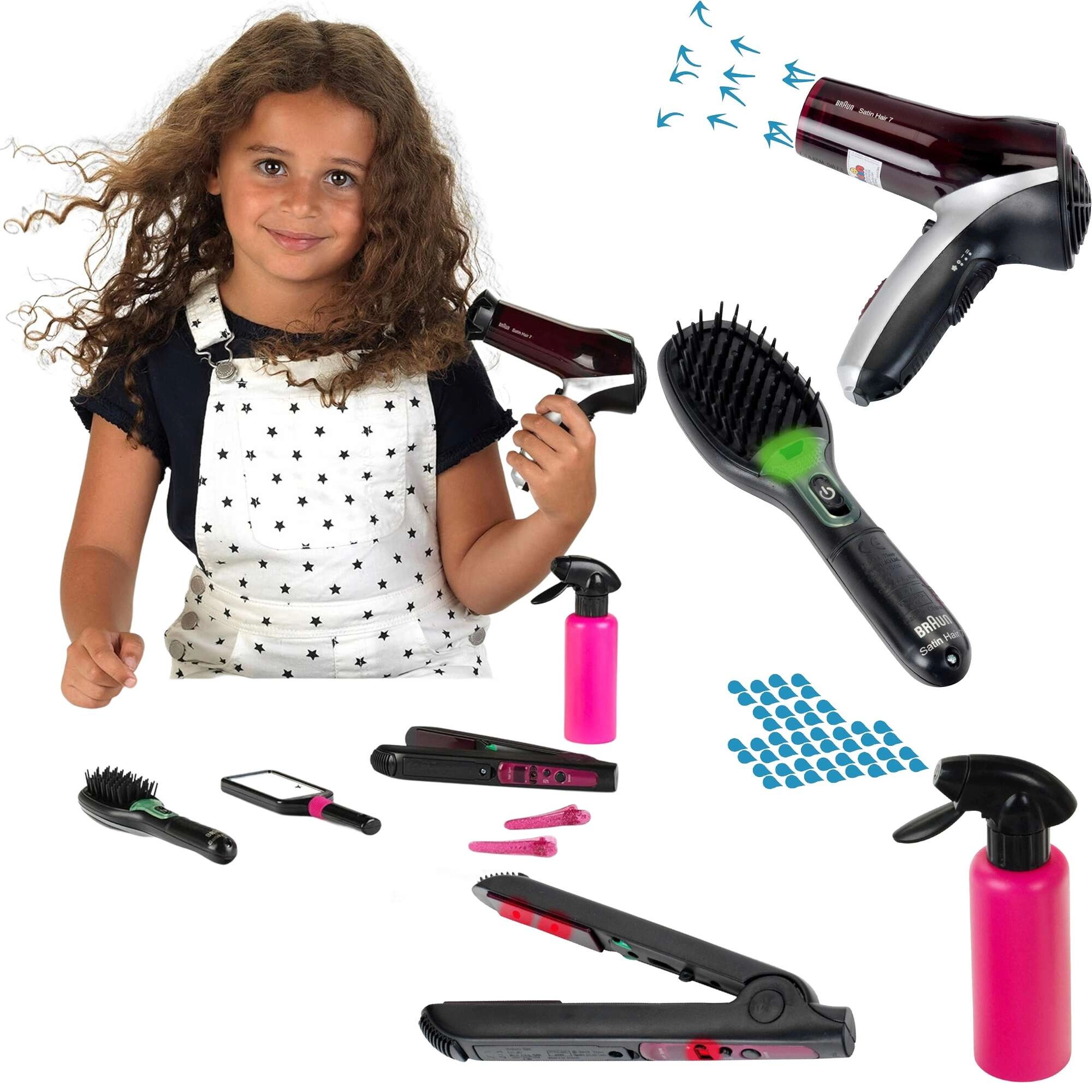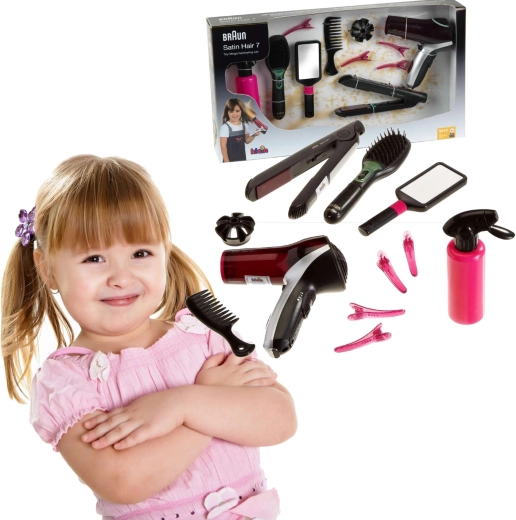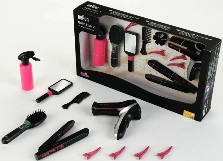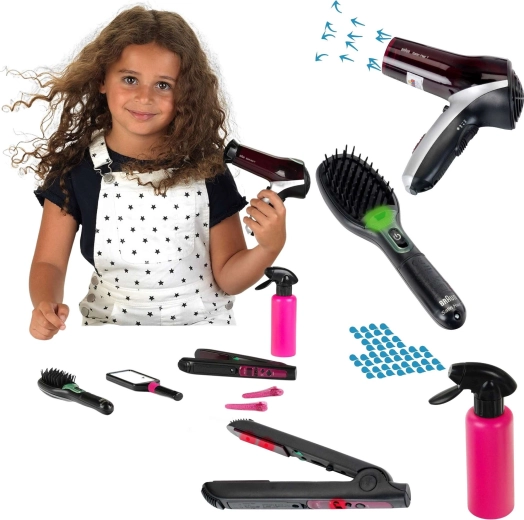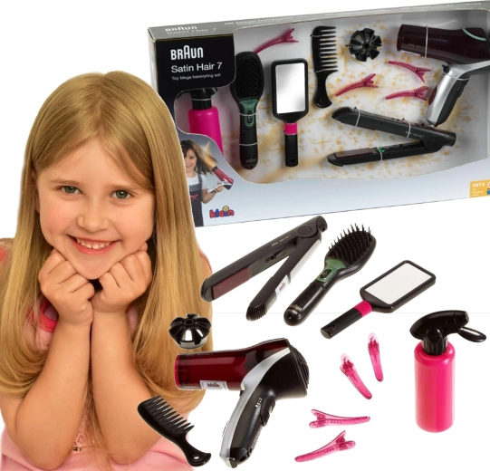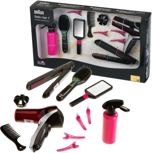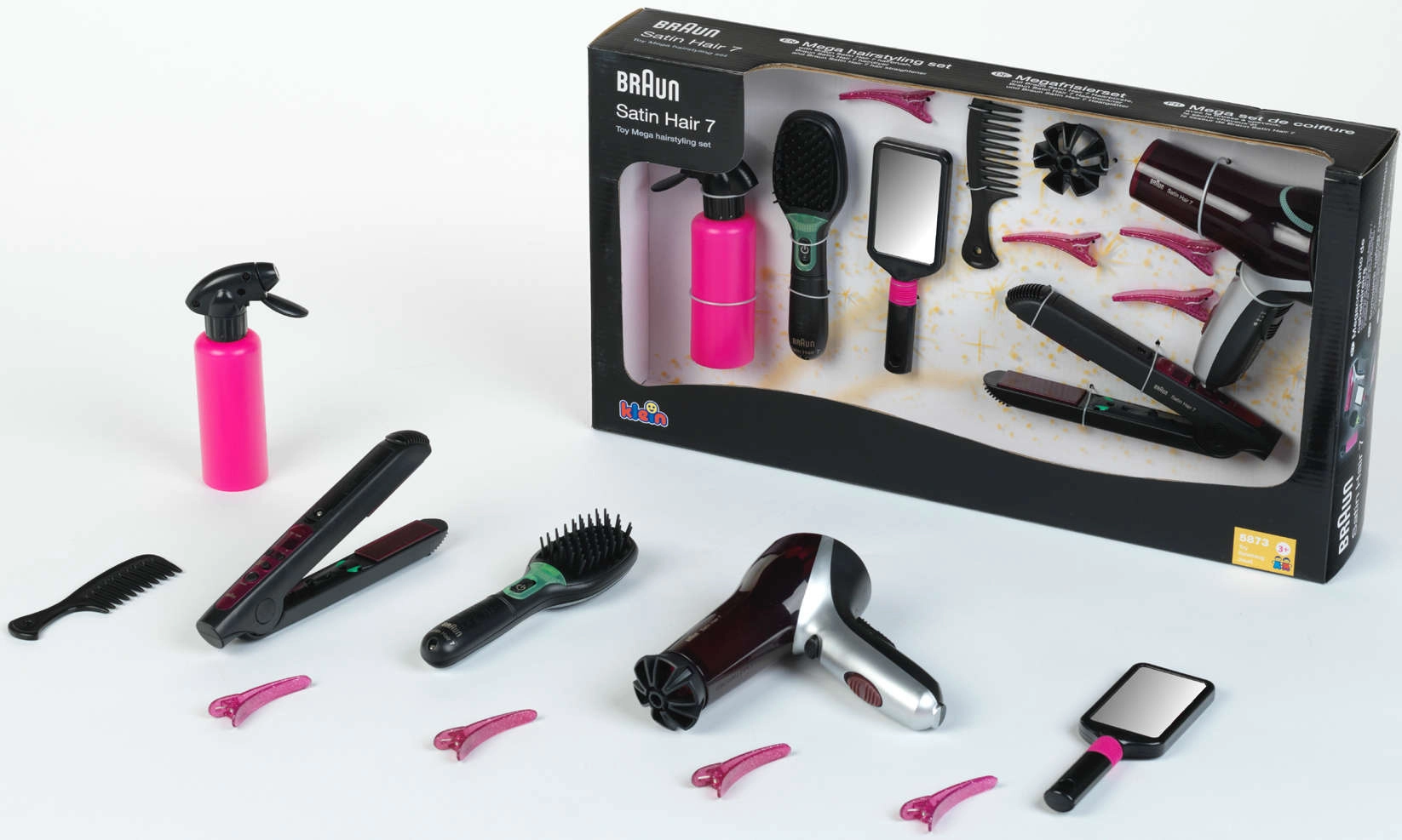 Das große Friseurset, inspiriert von der Serie BRAUN Satin Hair, bietet Kindern alles, was sie für stylische Frisuren brauchen. Die Spielzeuge sind auf Sicherheit ausgelegt und imitieren echte Tools – Föhn, Glätteisen und Bürste laufen mit Batterien und erzeugen realistische Licht- und Soundeffekte, erzeugen jedoch weder Hitze noch Luftstrom.