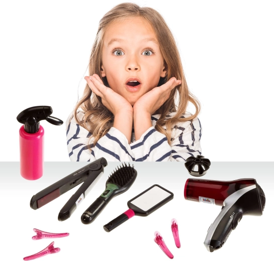 Spiegel, Kamm, Sprühflasche, Föhnaufsatz und vier glitzernde Spangen ermöglichen Kindern, Frisuren zu kreieren und stundenlang Friseur zu spielen.