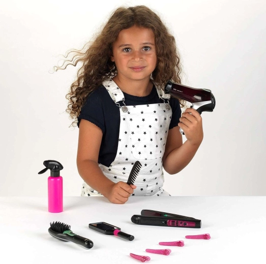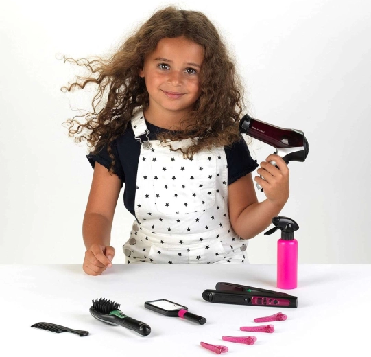 Zum Lieferumfang gehört auch praktisches Zubehör: Spiegel, Kamm, Sprühflasche für Wasser (befüllbar), ein wechselbarer Föhnaufsatz sowie 4 rosafarbene glitzernde Spangen zum einfachen Abteilen und Schmücken der Haare. So können Kinder einen echten Salon nachspielen und Fantasie, Feinmotorik und soziale Fähigkeiten entwickeln.