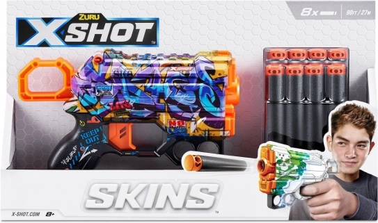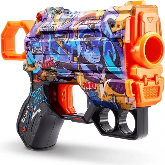 Der leichte und wendige X-Shot Skins Menace Blaster im Muster D bietet schnelle Action und Stil. Er verschießt Schaumstoffpfeile bis zu 27 Meter weit, verfügt über ein vorderes Schnellmagazin für Ersatzschüsse und bietet ein einzigartiges Graffiti-Design für maximalen Spaß und Übersicht im Gefecht.