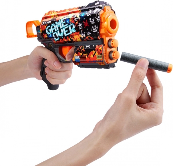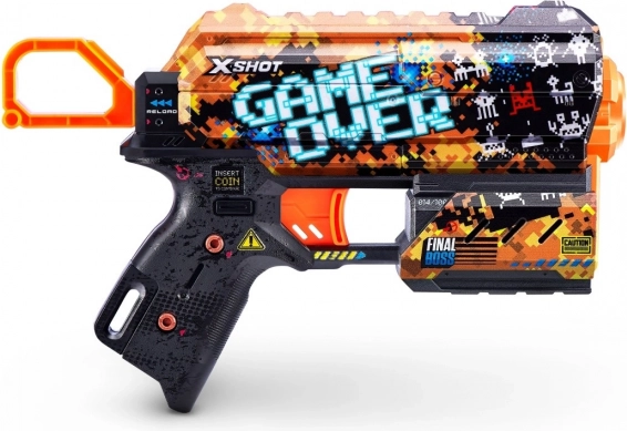 Bringen Sie Videospiel-Style in Ihre Battles mit der X-Shot Skins Flux im Game-Over-Motiv. Dank modernster Drucktechnologie wirkt der Blaster besonders attraktiv, während ergonomische Formen und das leichte Design auch bei längeren Matches für komfortable Handhabung sorgen.