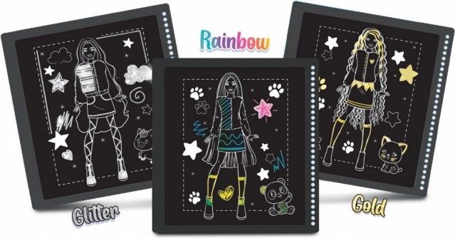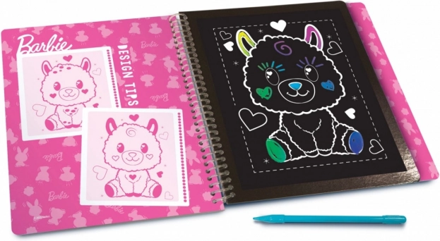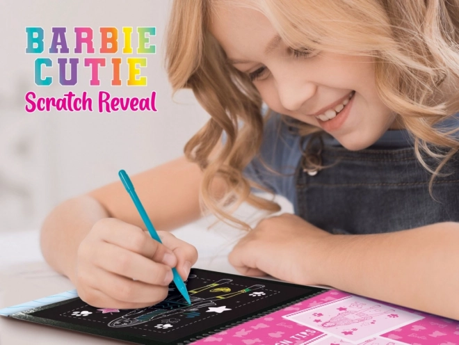 Entdecken Sie den Zauber der Farben mit Barbie im bezaubernden Stil. Mit dem beigefügten Stift kratzen Sie die schwarze Schicht des Papiers ab und enthüllen lebendige Regenbogenfarben in fantastischen Nuancen.