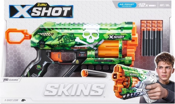 Im Lieferumfang sind 12 sichere Schaumstoff-Darts enthalten, die mit den meisten Blastern kompatibel sind. Das stylische Camo-Design und die SKINS-Serie laden zum Sammeln ein.
