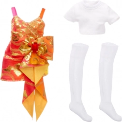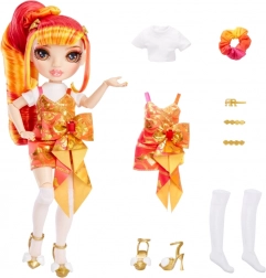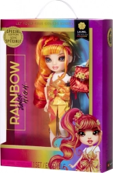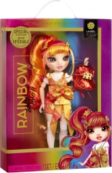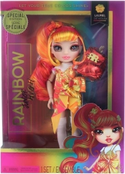 Laurel glänzt in einer orange‑goldenen Kombination mit markanten Details, die den Modecharakter der RAINBOW HIGH Serie unterstreichen.