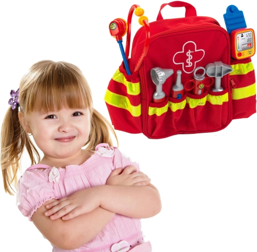 Entdecken Sie die Arztausstattung im kompakten Rucksack, der für kleine Hände und große Fantasie entwickelt wurde. Der rote Rucksack mit auffälligem Sanitätskreuz und reflektierenden Streifen erhöht die Sichtbarkeit beim Spielen im Freien, während clevere Taschen alle Instrumente stets griffbereit halten. Kinder trainieren Empathie, Feinmotorik und Kommunikationsfähigkeiten beim Rollenspiel als Arzt.