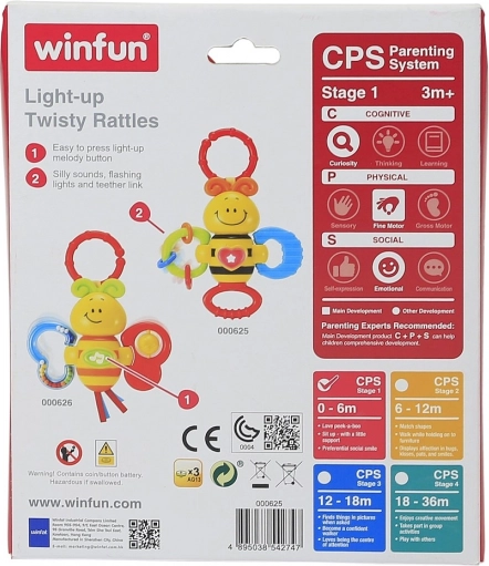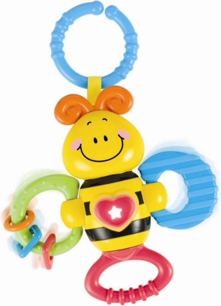 Diese farbenfrohe Biene ist ein großartiges erstes Spielzeug für die Kleinsten. Beim Schütteln erzeugt sie ein angenehmes Rasseln, und beim Drücken der zentralen Taste werden Melodien und ein blinkendes Licht aktiviert, die Neugier und Sinneswahrnehmung anregen. Die ergonomische Form und mehrere Greifringe erleichtern das Halten mit kleinen Händchen.
