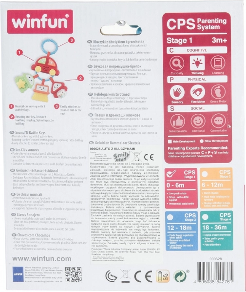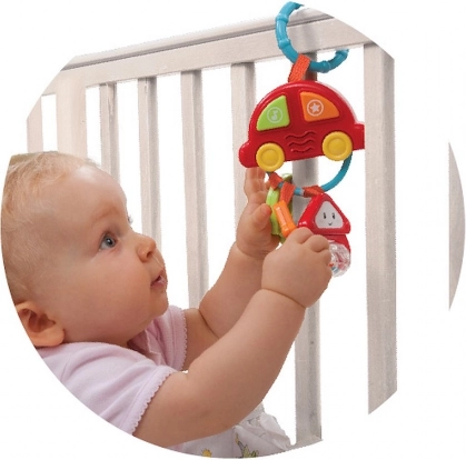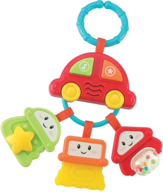 Auto mit Schlüsselbund ist ein buntes Spielzeug, das die Aufmerksamkeit jedes Babys auf sich zieht und deren Unterhaltung und Entwicklung unterstützt. Dieses Spielzeug kann auch als Beißring dienen.