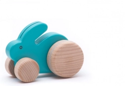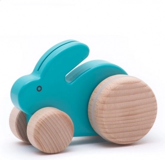 Dieser kleine blaue Hase aus der BAJO-Werkstatt überzeugt durch einen einfachen, aber genialen Mechanismus: Zwei schwere, exzentrisch gelagerte Räder drehen sich nicht um die Mitte, sondern im Kreis. So entsteht ein Effekt des Auf- und Abbewegens, durch den der Hase nach einem leichten Schubs fröhlich wippt und hopst. Das Spielzeug entwickelt manuelle Fähigkeiten, unterstützt die Grobmotorik und regt auf natürliche Weise Vorstellungskraft und Wissen über Tiere an.