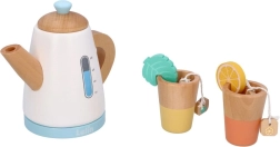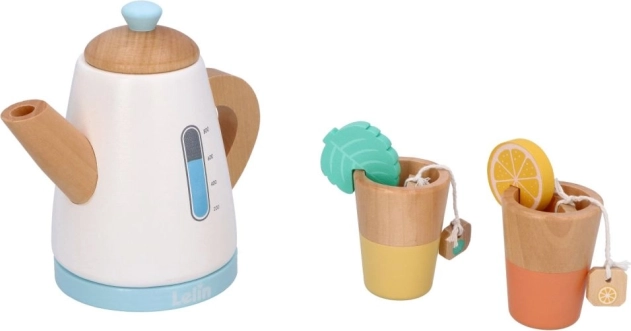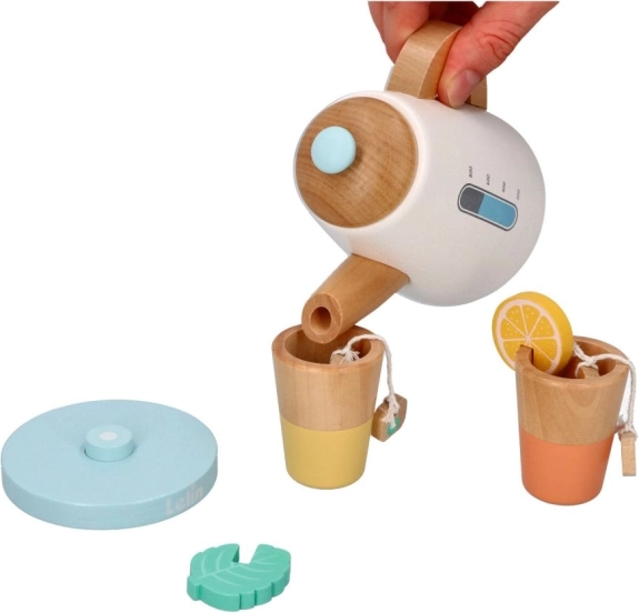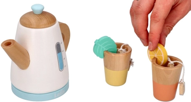 Nehmen Sie an einer Teeparty teil mit dem Holz-Teeservice, das eine Kanne, Tassen und Zubehör wie Zitronenscheiben und Teebeutel umfasst.