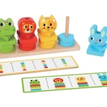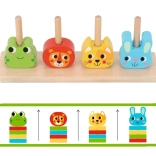 Vier Figuren – Frosch, Löwe, Katze und Kaninchen – motivieren zu kreativem Stapeln und fördern Fantasie sowie Wortschatz.