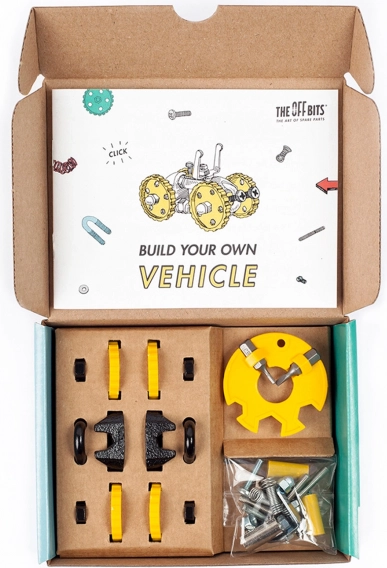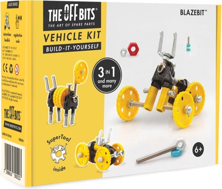 OFFBITS BlazeBit ist ein origineller Baukasten, inspiriert von der Re-Use-Kultur, der Schrauben, Rädchen und clevere Verbinder in bewegliche Modelle verwandelt. Baue BlazeBit, MotorBit, AnimalBit oder erfinde deine eigene Maschine – der Fantasie sind keine Grenzen gesetzt.