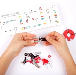 Die Teile lassen sich kreativ mit Karton, Schrauben und anderen Alltagsgegenständen kombinieren, sodass die Baumöglichkeiten praktisch unbegrenzt sind. Mit dem beiliegenden Multifunktionswerkzeug gelingt die Montage einfach und sicher – ideal für angehende Konstrukteurinnen und Konstrukteure.