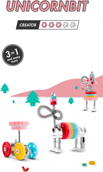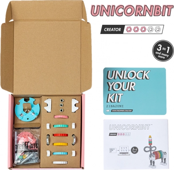 Der magische UnicornBit eröffnet Kindern eine Welt voller Fantasie und technischer Geschicklichkeit. Aus einem Set bauen Sie 3 verschiedene Modelle – UnicornBit, den märchenhaften RobotBit oder AutoBit – und dank der Kompatibilität mit Alltagsgegenständen zu Hause entstehen auch ganz eigene, einzigartige Erfindungen.
