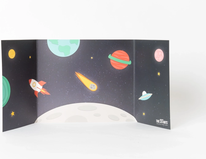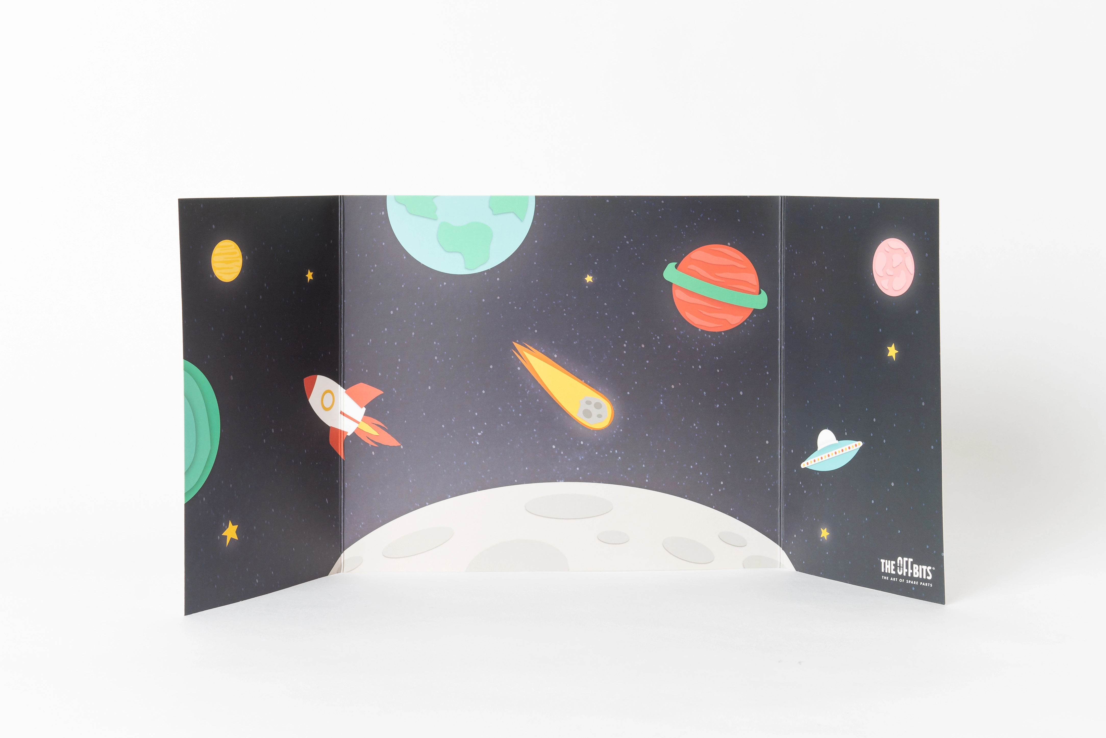 Ein faltbarer Papphintergrund mit Weltraummotiv schafft eine beeindruckende Umgebung zum Spielen und Fotografieren der fertigen Modelle. Die stabile dreiteilige Konstruktion erweitert die Spielwelt.