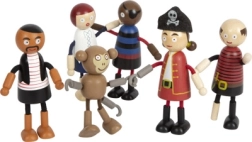 Das Set enthält sechs Holzfiguren: einen Piratenkapitän, vier Crewmitglieder und einen Affen. Ideal zur Erweiterung der Piratenwelt.