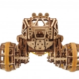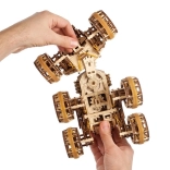 Der sechsrädrige Antrieb mit vollständig unabhängiger Federung meistert Unebenheiten mit Leichtigkeit. Der Federmotor wird mit einem Ratschenschlüssel aufgezogen und setzt das Modell auf glatten Oberflächen in Bewegung.