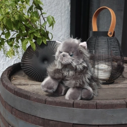 Langer, extra weicher grauer Plüsch, blaue Augen und rosafarbene Öhrchen machen die Katze zu einem treuen Kuschelfreund und einer schönen Dekoration.