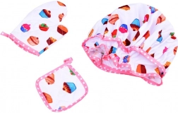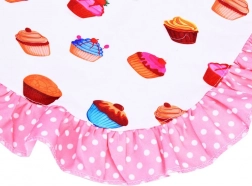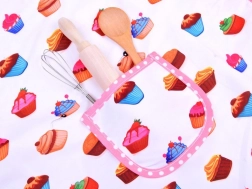 Schürze und Zubehör mit buntem Cupcake-Muster und rosa Rüschen schützen die Kleidung und bringen Spaß und Stil in die Küche.