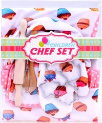 Im Set ist alles enthalten: Schürze, Mütze, Handschuh, Unterlage, Nudelholz, Holzlöffel, Schneebesen und 4 metallene Ausstechformen. Kinder können sofort mit dem Backen und Kreativsein loslegen.