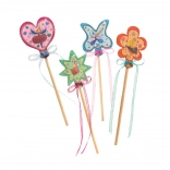 Gestalten Sie bis zu vier unterschiedliche Zauberstäbe und verzieren Sie jeden ganz nach Geschmack – mit farbigen Bändern und Abreibebildern. Das Ergebnis sind originelle Accessoires für Rollenspiele als Feen, Prinzessinnen oder Zauberer.