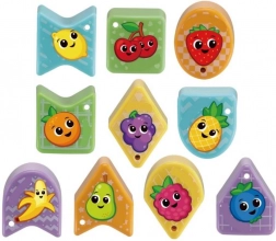 Das interaktive Element in Form des Stiels bringt neue Herausforderungen und Spielvarianten. Das Einsetzen und Herausnehmen der Teile fördert die Feinmotorik, die Hand–Auge-Koordination sowie das logische Denken, während die Obstmotive den Wortschatz erweitern und das Erkennen von Formen unterstützen.