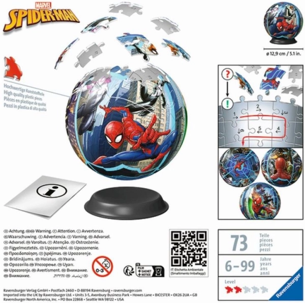 Genießen Sie ein einzigartiges Bauerlebnis mit der Ravensburger 3D-Puzzle-Kugel. Jedes Teil ist präzise gefertigt, sodass es perfekt ineinandergreift und eine stabile Kugel mit dynamischem SPIDERMAN-Motiv bildet. Kleber ist nicht erforderlich – das Ergebnis ist ein glattes und stabiles Modell, das im Regal oder auf dem Schreibtisch hervorsticht.