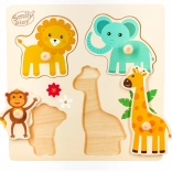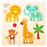 Dieses Holzsteckpuzzle enthält vier Tierteile und eine stabile Platte mit passgenau geformten Öffnungen. Jedes Teil hat einen bequemen Griffknopf, der die Handhabung für Kinder erleichtert und das Lernen natürlich und spielerisch macht.