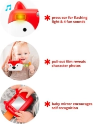 Drücken Sie das Fuchsohr und aktivieren Sie das Klicken des Auslösers, lustige Effekte und ein blinkendes Licht wie ein Blitz. Ideal zur Sinnesstimulation und für die erste Fotografenrolle.